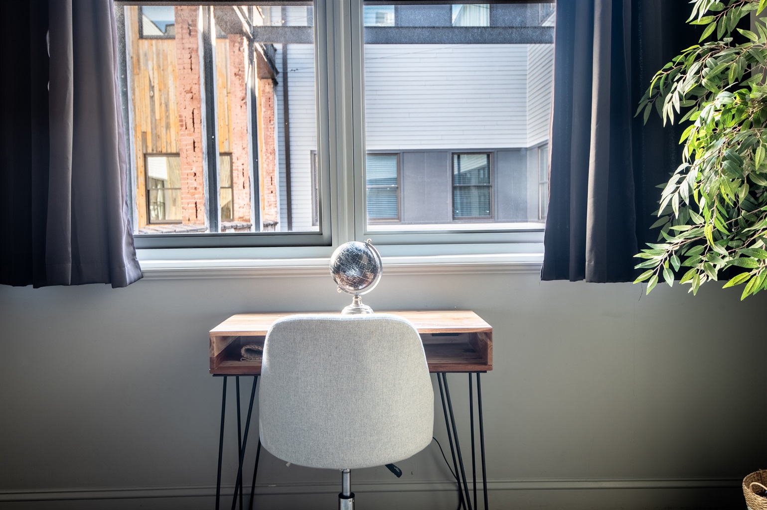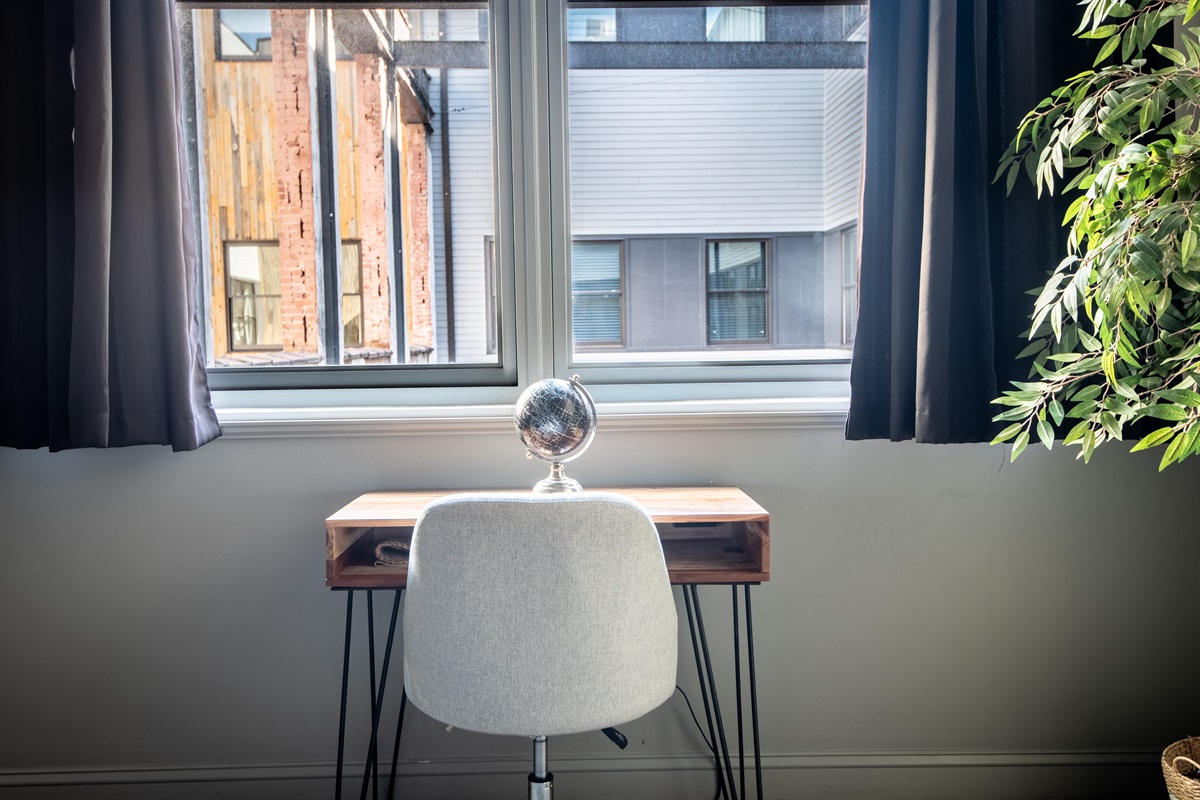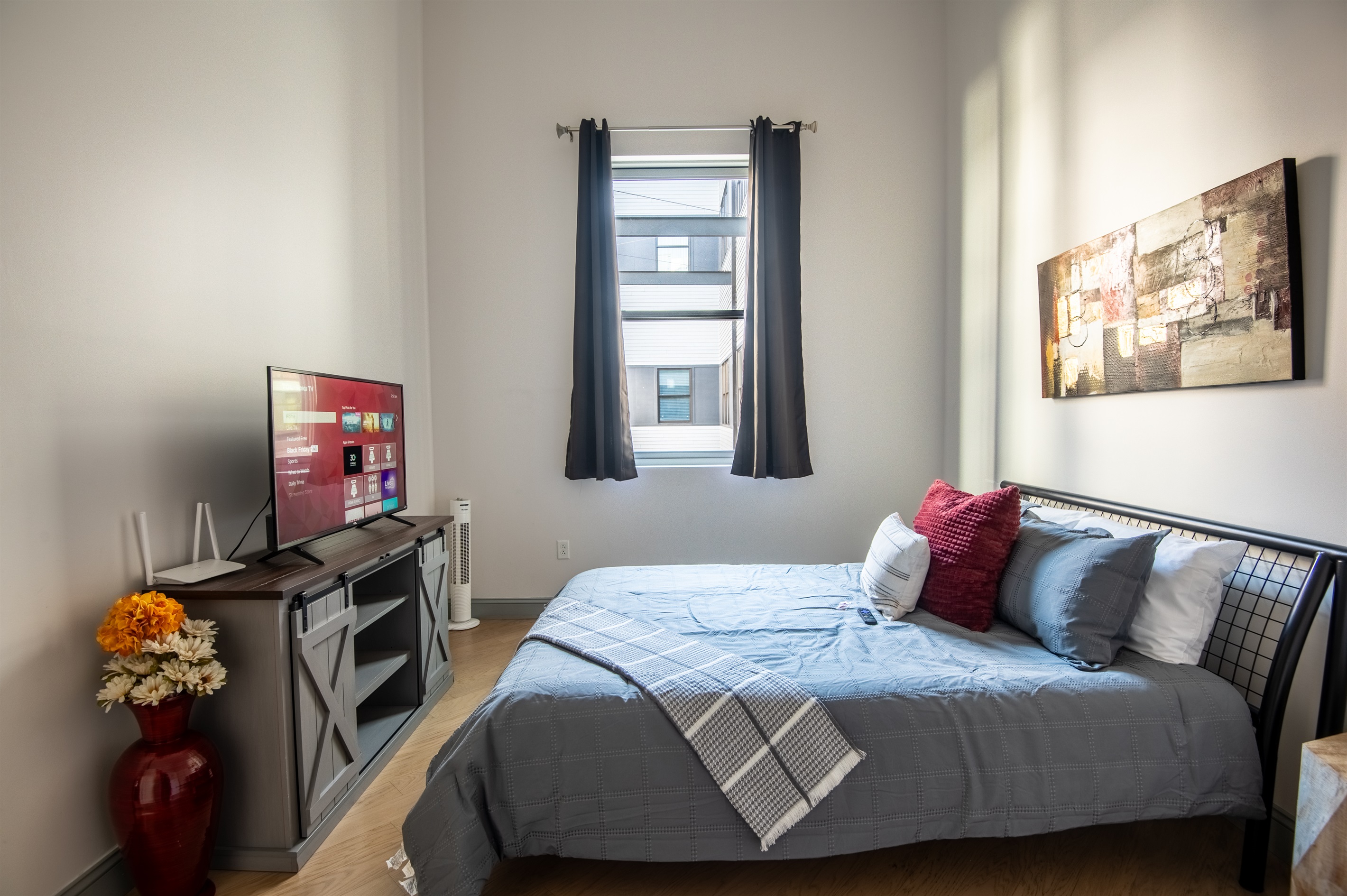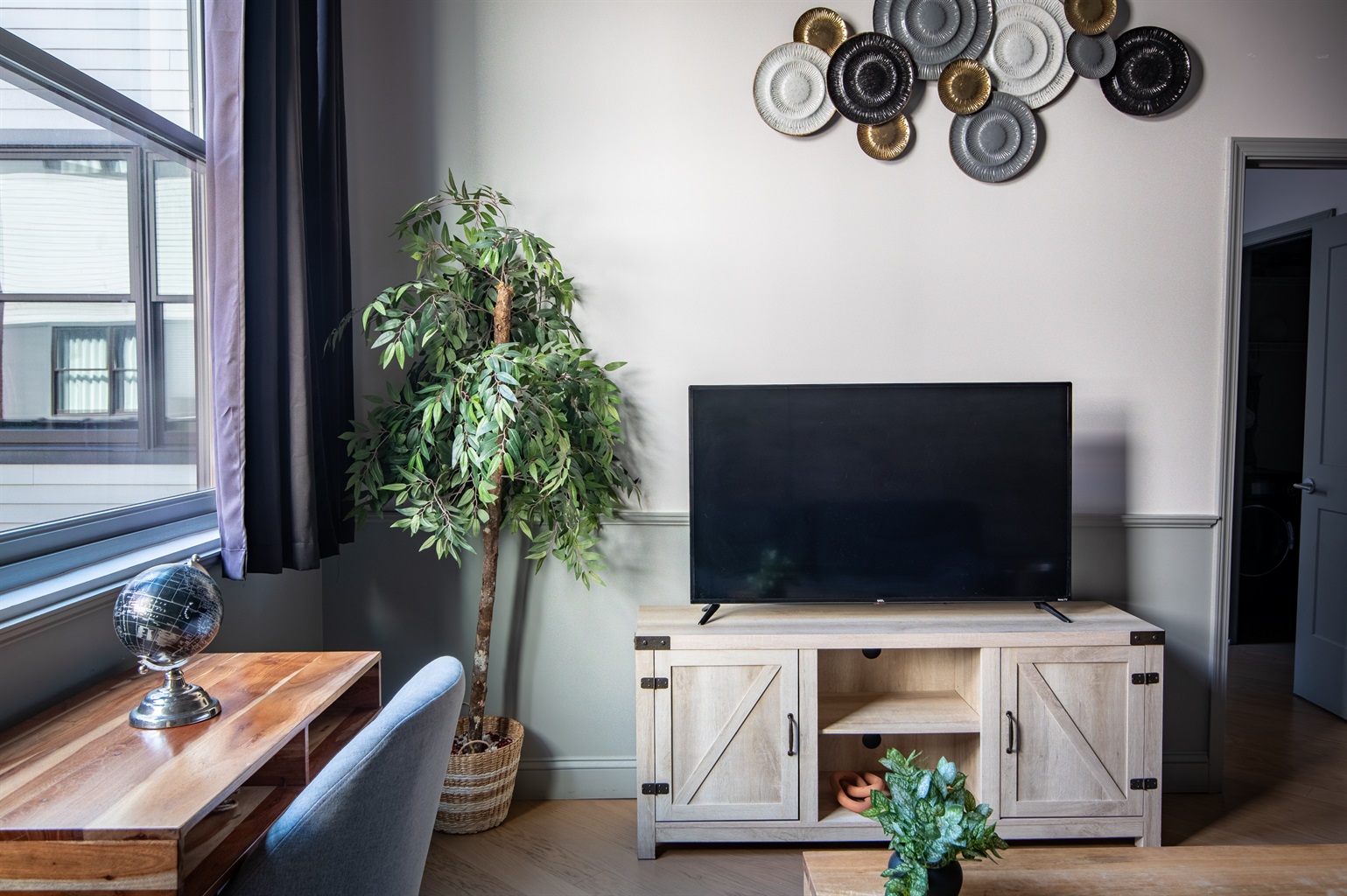 The space is designed with your comfort in mind. It has lovely natural light in the highly accommodating living area and a capable work desk with a delightful chair for your business on the go. Its incredibly modern and entirely updated renovations provide all you’ll need to relax and create your home away from home. A large luxurious shower is available for you to freshen up with eco friendly hotel sized toiletries for you to enjoy so you don’t have to bring yours. When you're done for the day chill out under the BIG ASS FAN (actual brand name) in the bedroom on a high quality mattress and enjoy your favorite shows and/or sports on the Roku TV. When you wake up in the morning let that first sip of coffee we have provided warm your soul and if you so choose make some breakfast in the fully equipped kitchen.