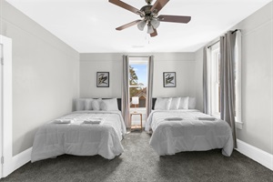 Upstairs, you’ll find four additional bedrooms, each full of character and natural light. A mix of full and twin beds makes the layout flexible for groups, and a futon at the top of the stairs provides even more sleeping space. A second full bathroom with a shower is conveniently located on this level as well.