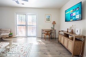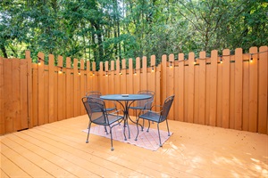 Enjoy cooking in a fully stocked kitchen with stainless appliances, granite countertops, and a charming breakfast nook. Unwind in the inviting living room with modern décor and a smart TV, or step outside to the private deck for coffee in the trees. Each bedroom offers plush bedding, blackout curtains, and ceiling fans to ensure a restful night’s sleep. The primary suite includes an en suite bath and ample closet space.