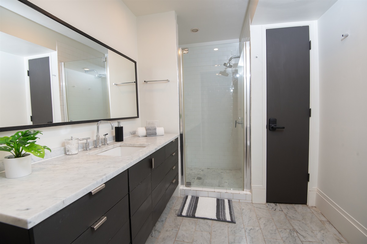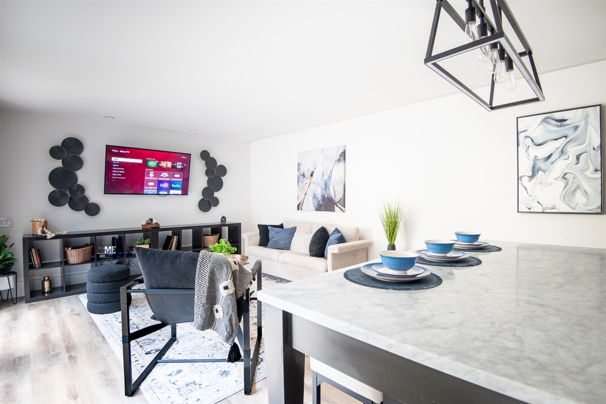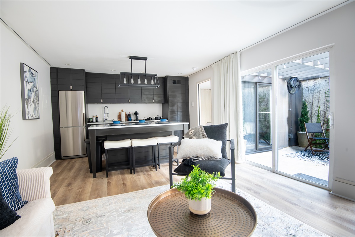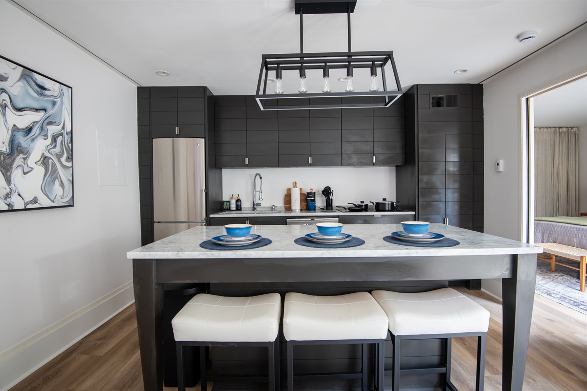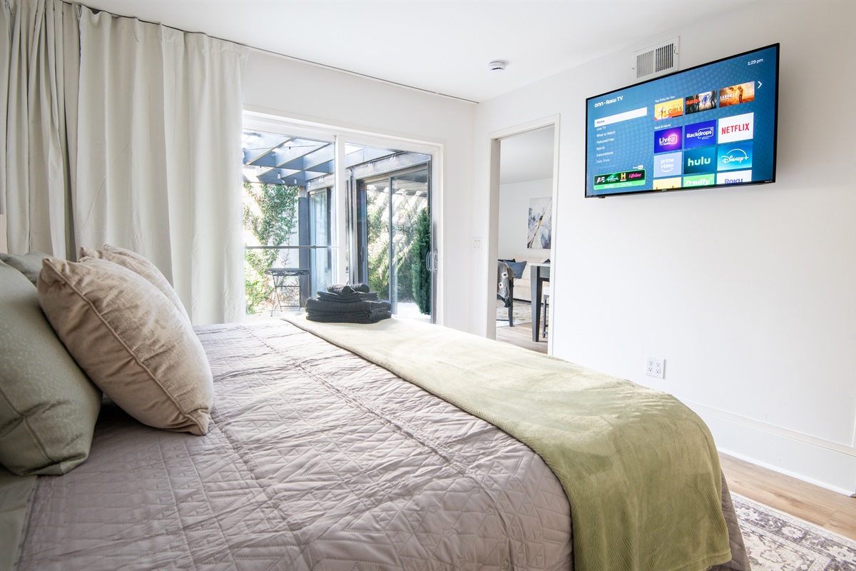 1 Bedroom • 1 Bathroom 1 Bath • Sleeps 1-3Whip up meals in the fully equipped kitchen featuring stainless steel appliances, sleek countertops, and all essentials. Relax in the open living area with a smart TV, or step onto your private balcony for city views and fresh air. The spacious bedroom boasts a plush king bed, blackout curtains, and a ceiling fan for restful sleep, plus ample closet space.