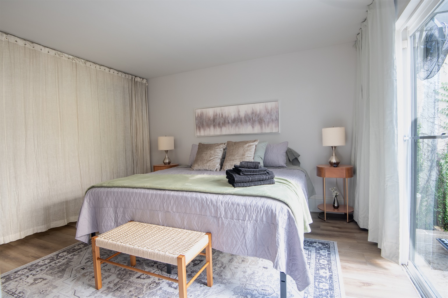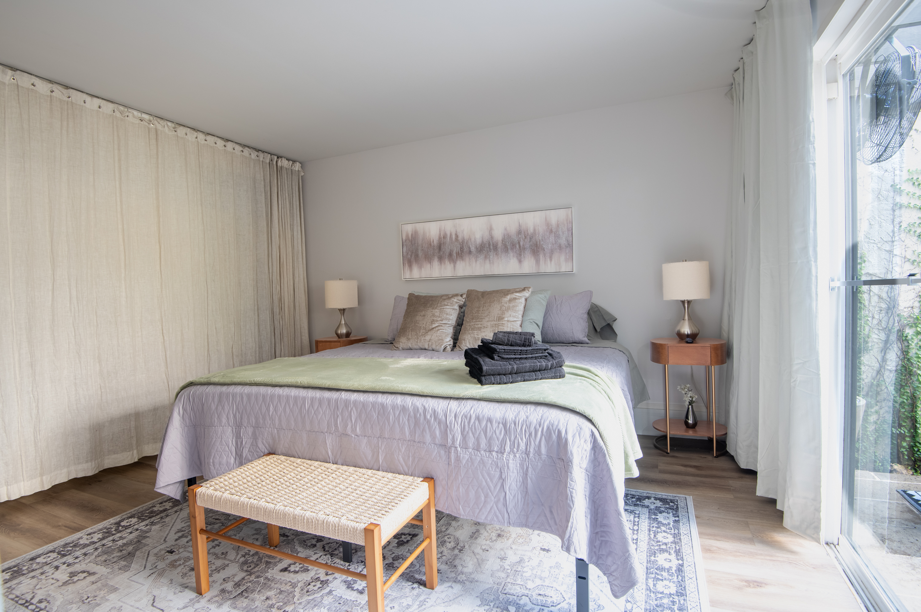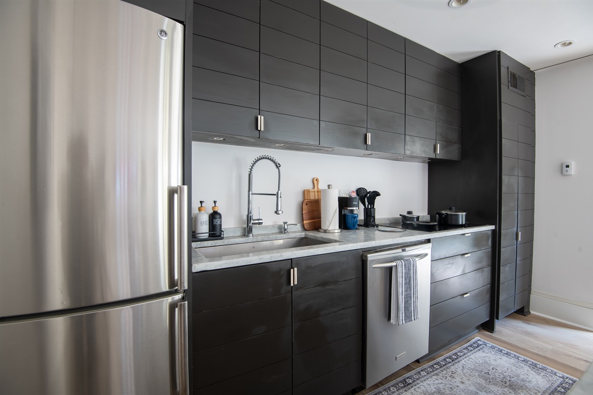 1 Bedroom • 1 Bathroom 1 Bath • Sleeps 1-3Whip up meals in the fully equipped kitchen featuring stainless steel appliances, sleek countertops, and all essentials. Relax in the open living area with a smart TV, or step onto your private balcony for city views and fresh air. The spacious bedroom boasts a plush king bed, blackout curtains, and a ceiling fan for restful sleep, plus ample closet space.