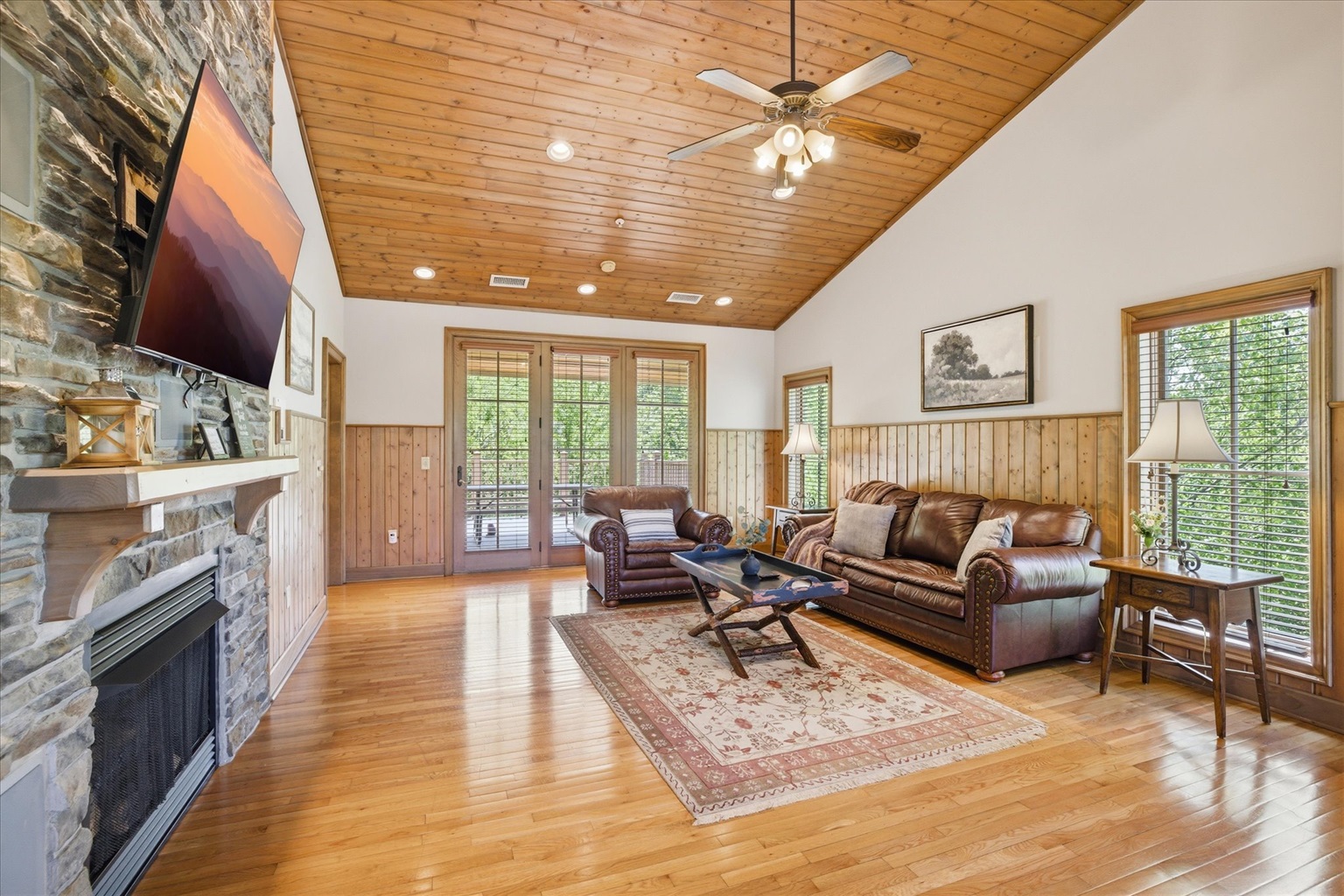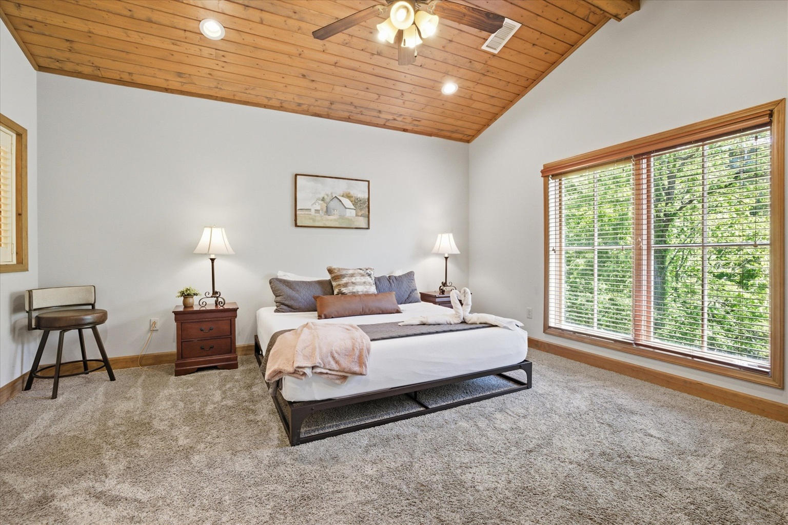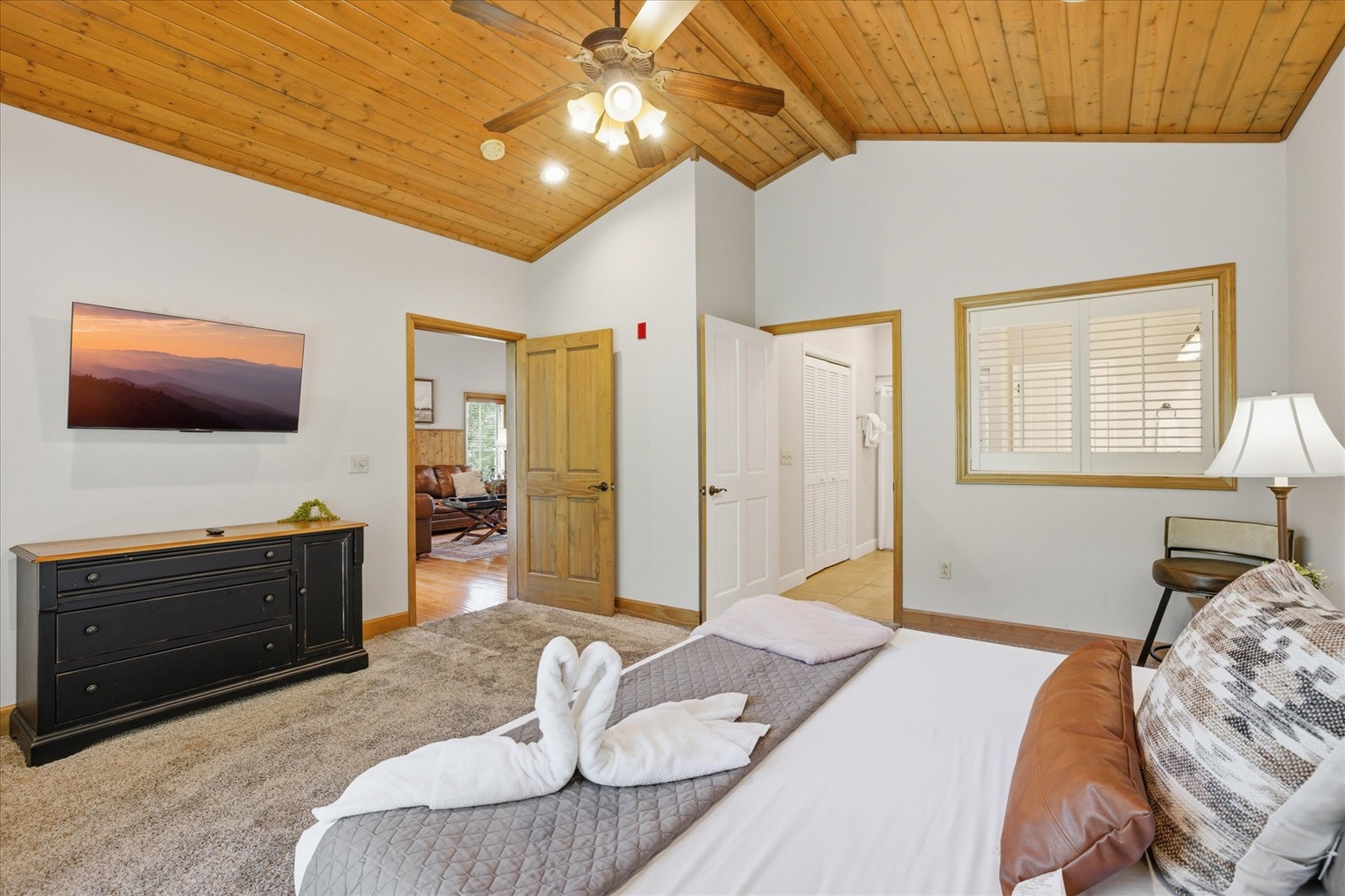 Inside, you’ll find a warm, inviting space with natural wood accents, soft textures, and a layout designed for comfort. The living area provides a cozy place to unwind after a day out, whether you’re watching a movie, enjoying a quiet evening in, or simply slowing down and recharging.
