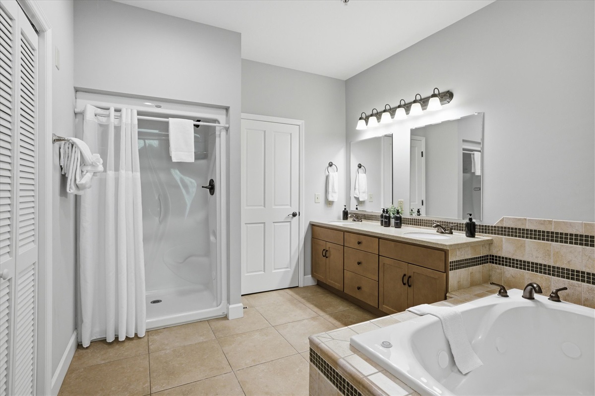The bedroom features a king bed and a calm, restful atmosphere designed for a good night’s sleep. The spacious bathroom includes both a soaking tub and a separate shower, giving you the option to unwind and relax at your own pace. A TV in the bedroom and living area adds an extra level of comfort for downtime.