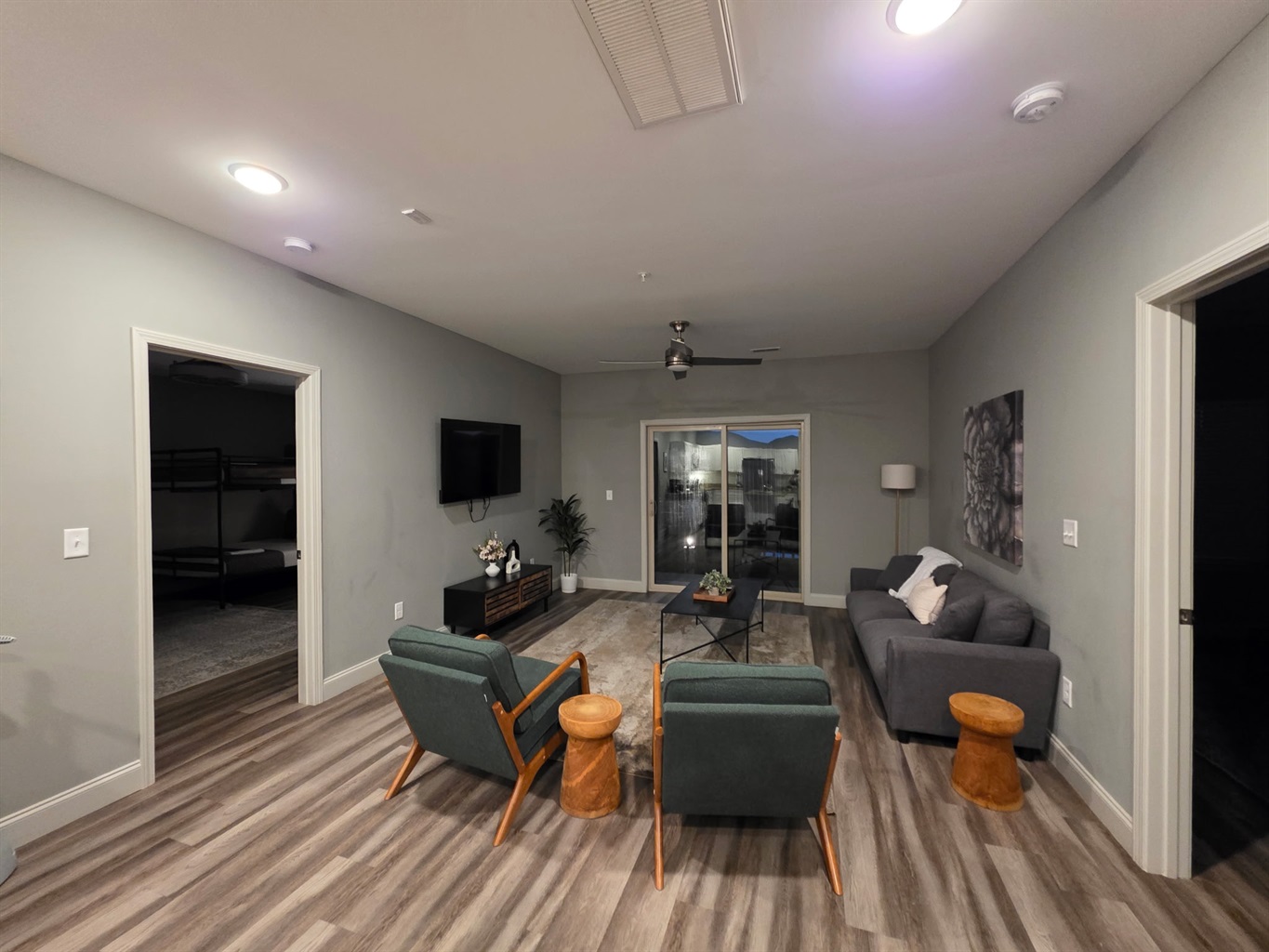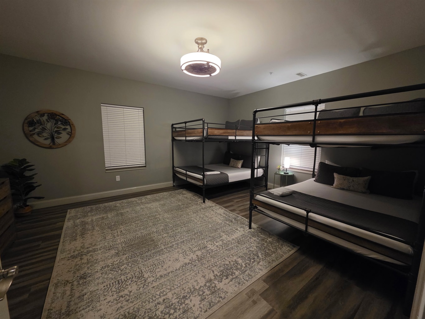 The primary suite features a plush king bed and a spa-like bathroom with a walk-in, stone-plated shower and double sinks—perfect for getting ready without the crowd. The second bedroom is ideal for families or groups, offering two queen-over-queen bunk beds that comfortably sleep multiple guests, along with its own TV and easy access to the second full bathroom, also featuring double sinks and a beautifully tiled walk-in shower.