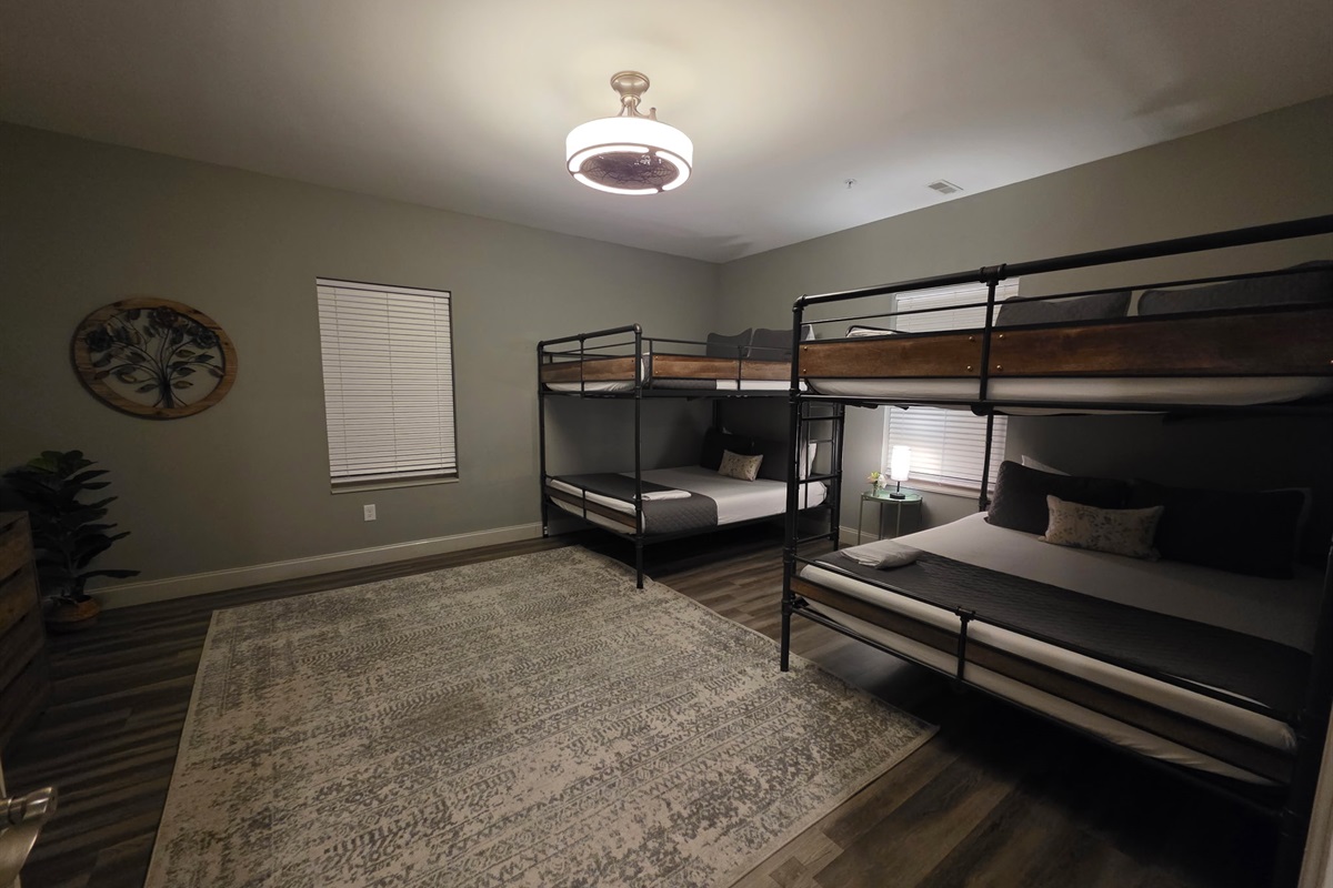 The primary suite features a king bed and a private en-suite bathroom with double sinks and a walk-in stone shower, offering a spa-like retreat. The second bedroom is perfect for families or groups, with two queen-over-queen bunk beds and its own TV, along with easy access to the second full bathroom—also featuring double sinks and a walk-in stone shower.