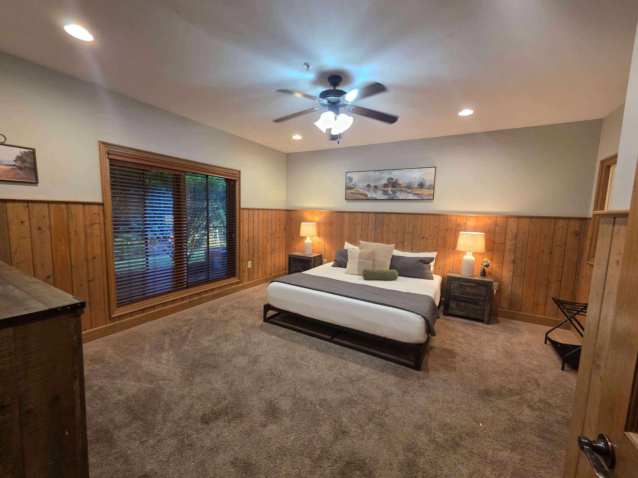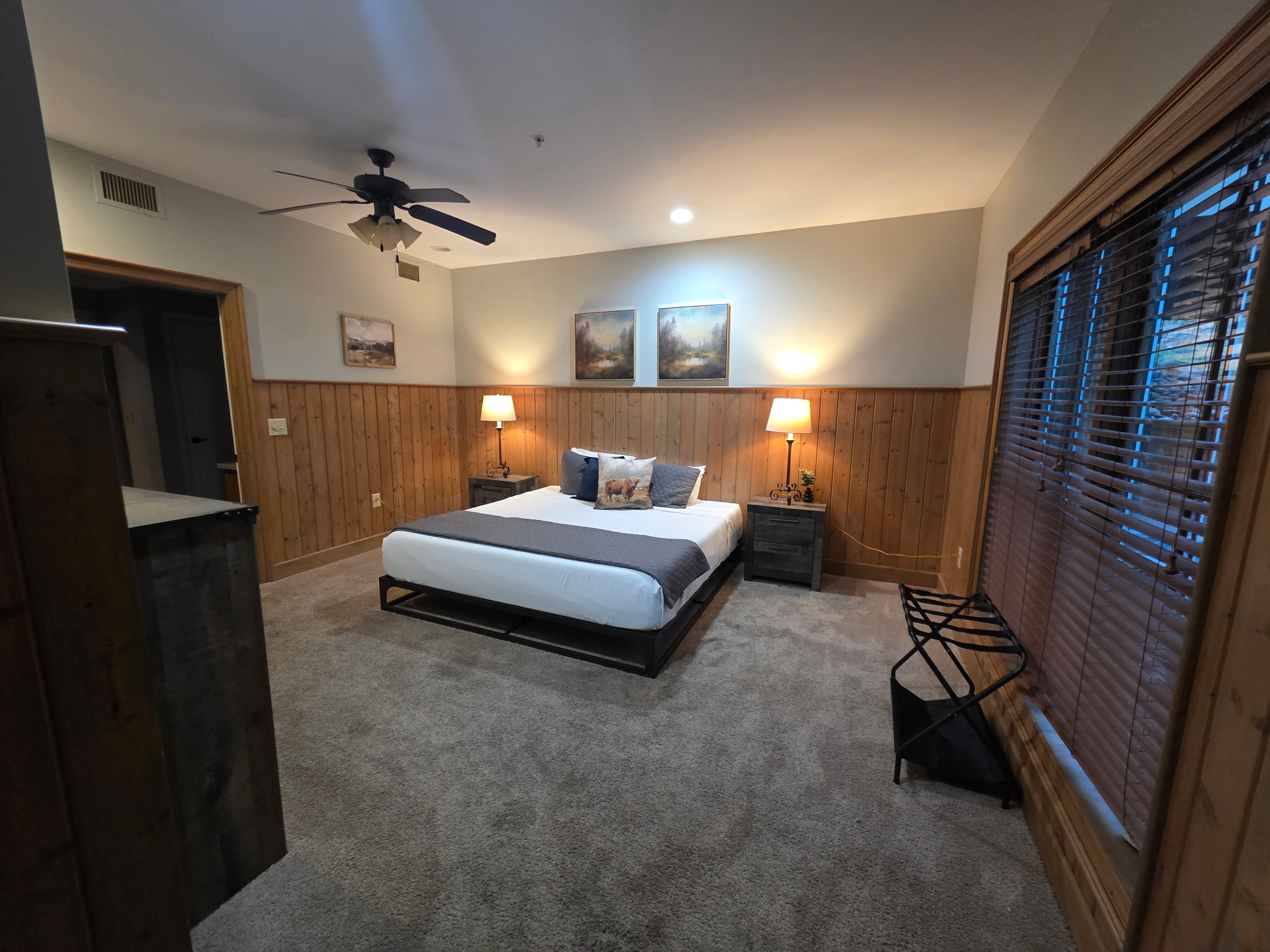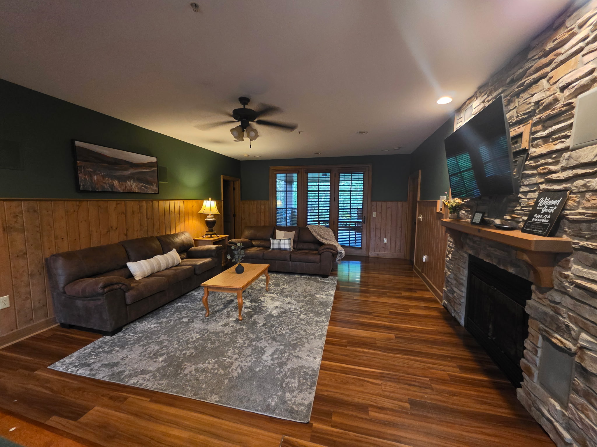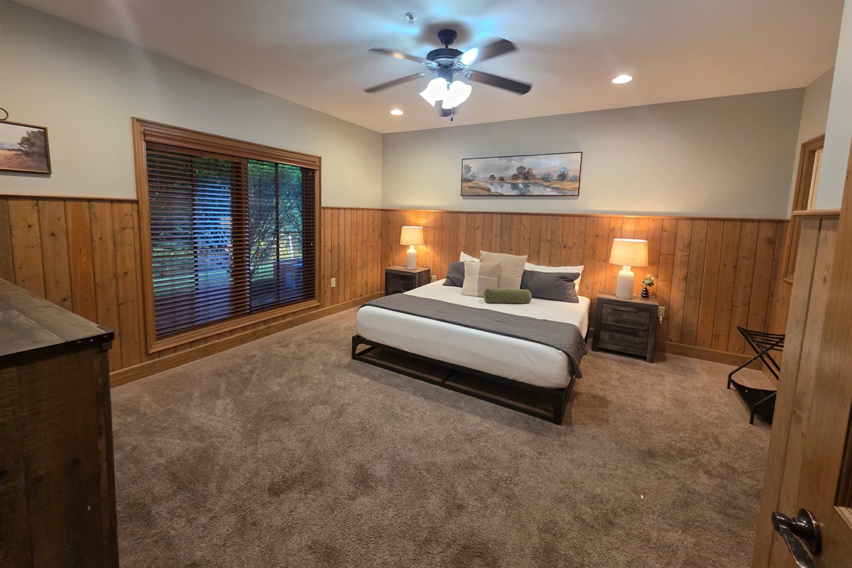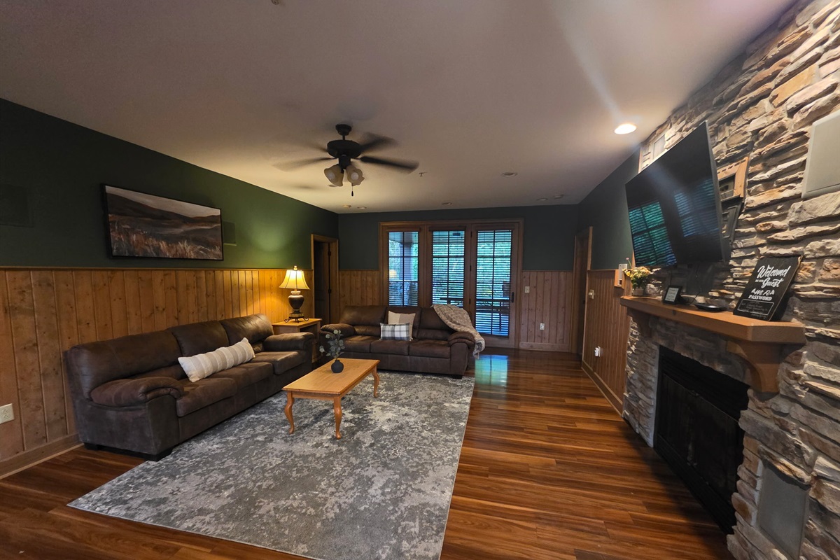 Step inside and you’re welcomed by a warm, cabin-inspired space with rich wood accents, cozy textures, and room to truly spread out. The open living area invites you to settle in, whether that’s sinking into the comfortable couches for a movie night or gathering together after a full day in town.