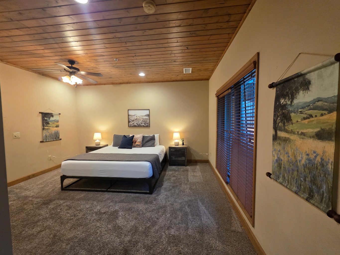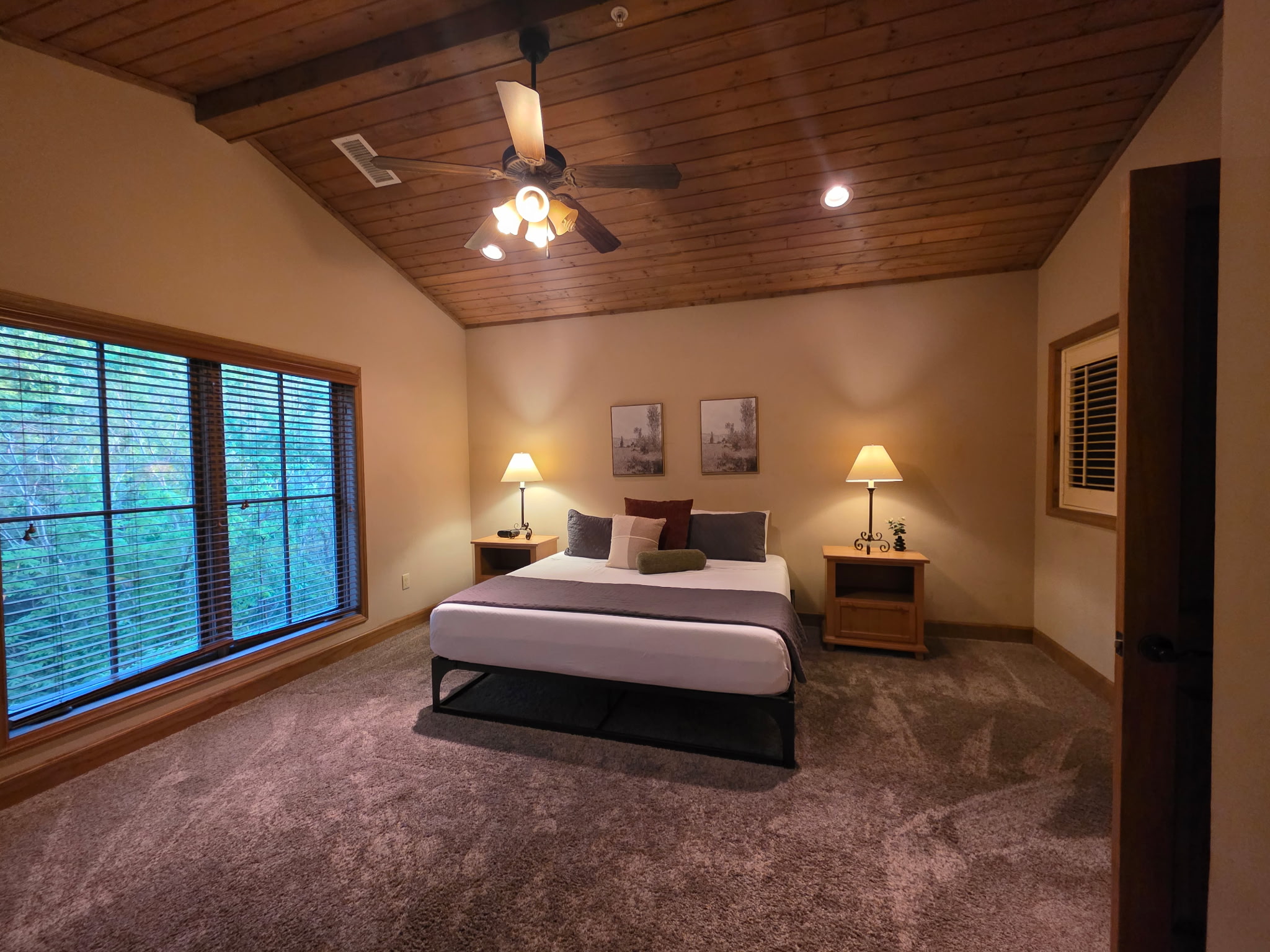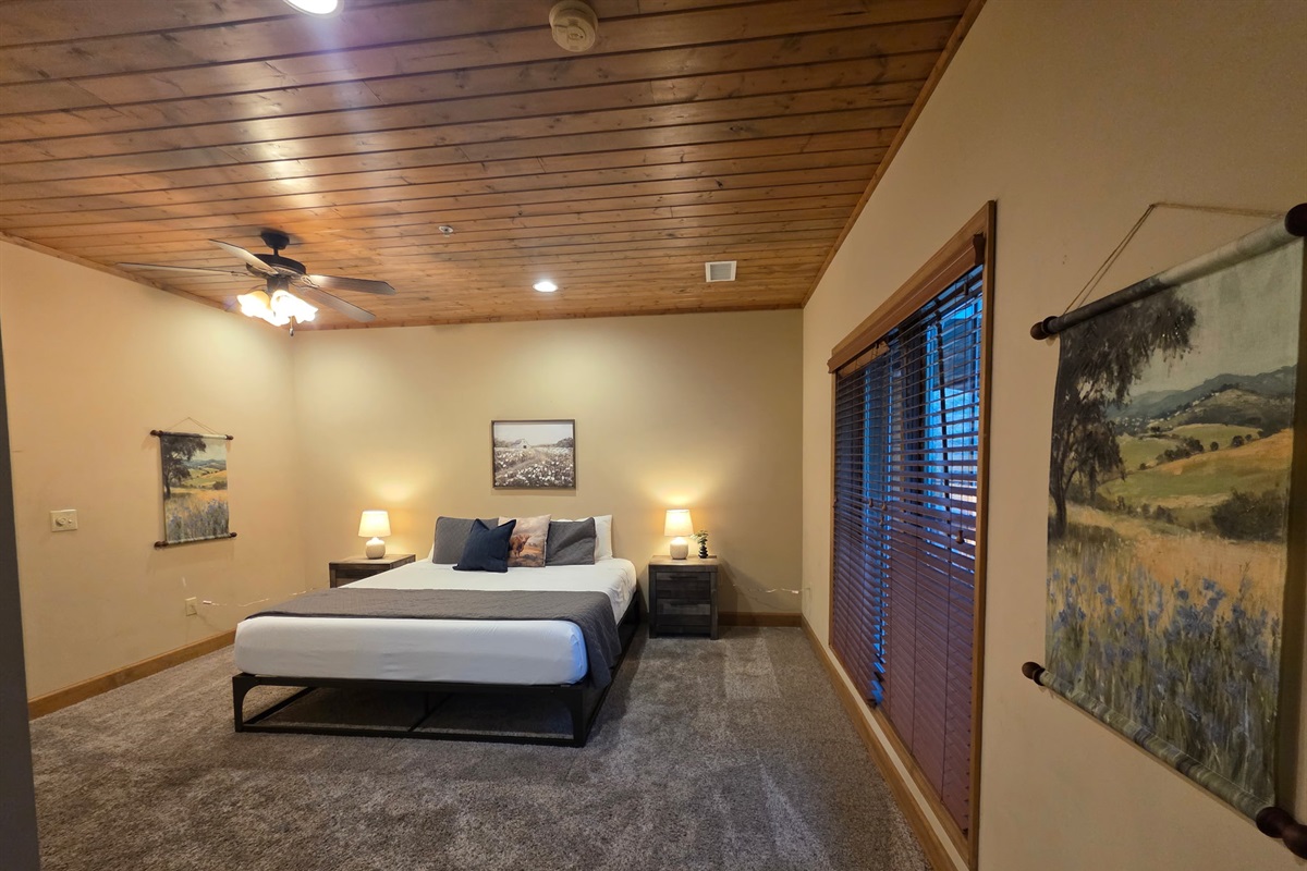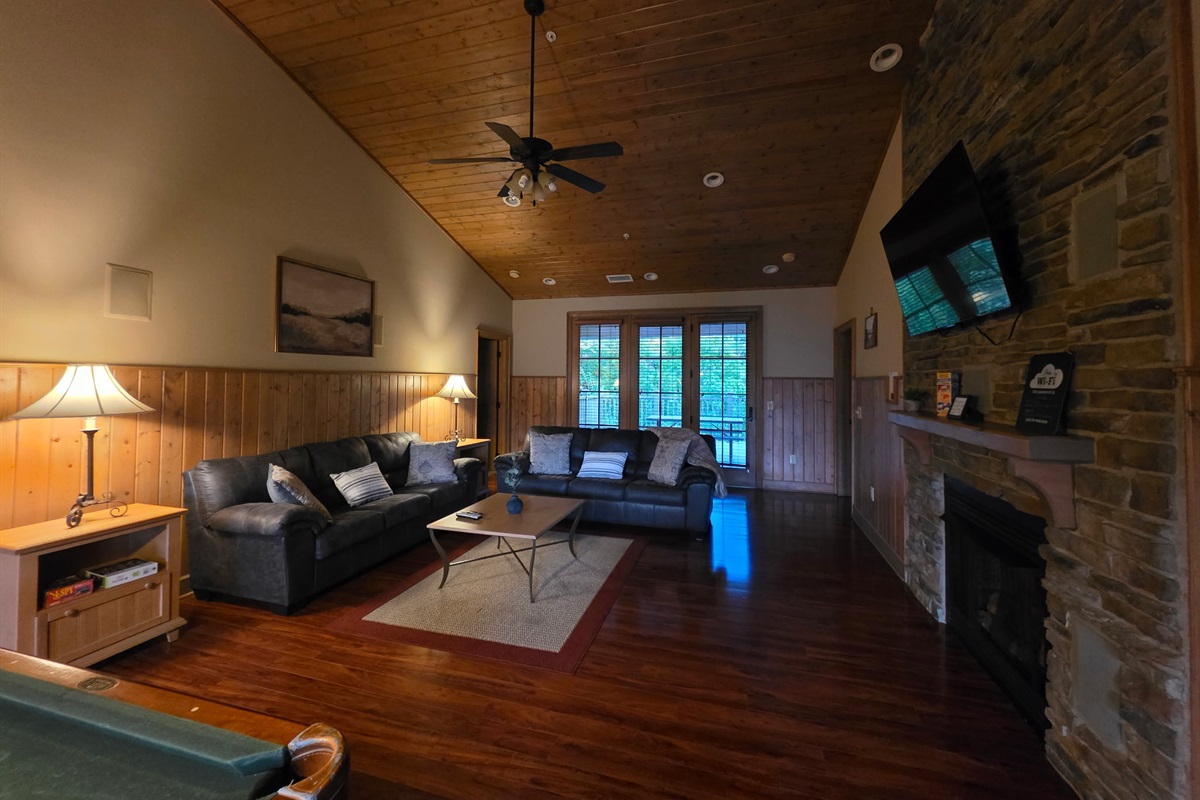 Step inside and you’re welcomed by a warm, cabin-inspired space with rich wood accents, cozy textures, and room to truly spread out. The open living area invites you to settle in, whether that’s sinking into the comfortable couches for a movie night or gathering together after a full day in town.