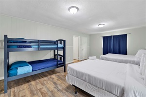 Just down the hall, you’ll find thoughtfully arranged sleeping spaces designed with flexibility in mind. One bedroom features a king bed for a more elevated, restful retreat, while another offers a cozy queen. The additional sleeping area includes a combination of full beds and bunk beds—perfect for groups, families, or anyone traveling together who wants both comfort and convenience.