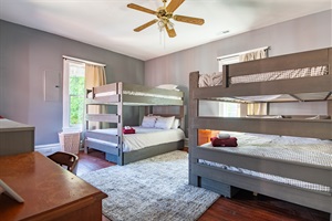 The suite features two bedrooms, each designed with comfort and flexibility in mind. One bedroom includes a queen bed and its own bathroom, offering a more private retreat. The second bedroom is larger and outfitted with two queen bunk beds, making it ideal for groups, friends, or families traveling together.